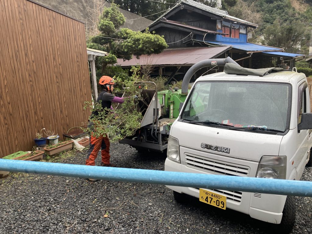 かさ張る枝葉もチップにして、直接軽トラックに載せて搬出処分します。